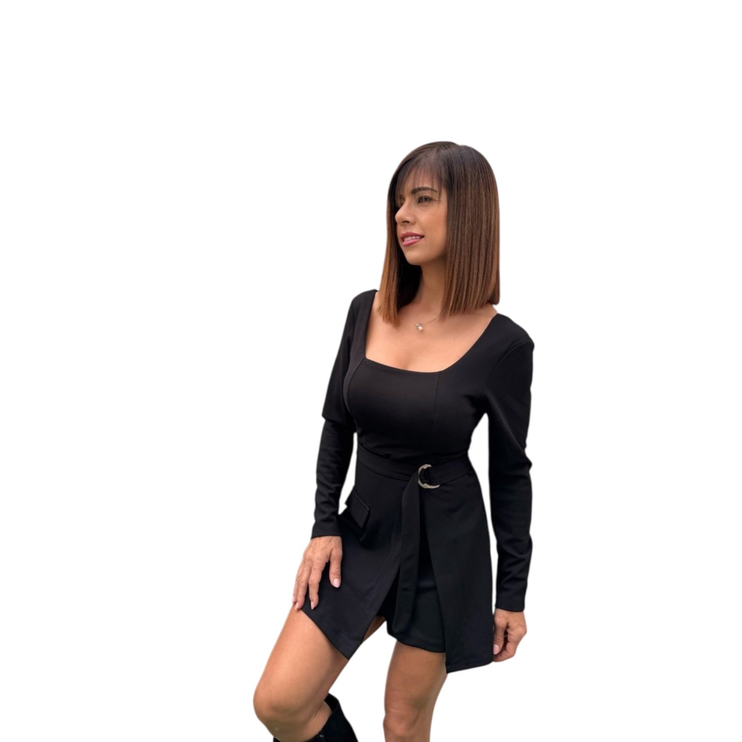 Mono escote cuadrado corto con detalle dorado en la parte de la falda, cierra con cremallera invisible.